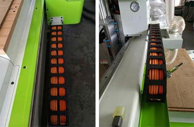 采用新型拖鏈,內(nèi)分格,將信號(hào)線、電源線按照規(guī)格區(qū)分開(kāi),更好的防御信號(hào)干擾,同時(shí)也杜絕了線纜工作過(guò)程中擰在一起。電纜線采用高揉性屏蔽線,使用壽命更長(zhǎng) |