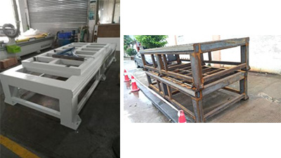采用方鋼焊接,回火處理,消除焊接應力,保證使用多年后不會變形。床身加強筋比較密集,增加了床身強度,保證底板不變形。 |